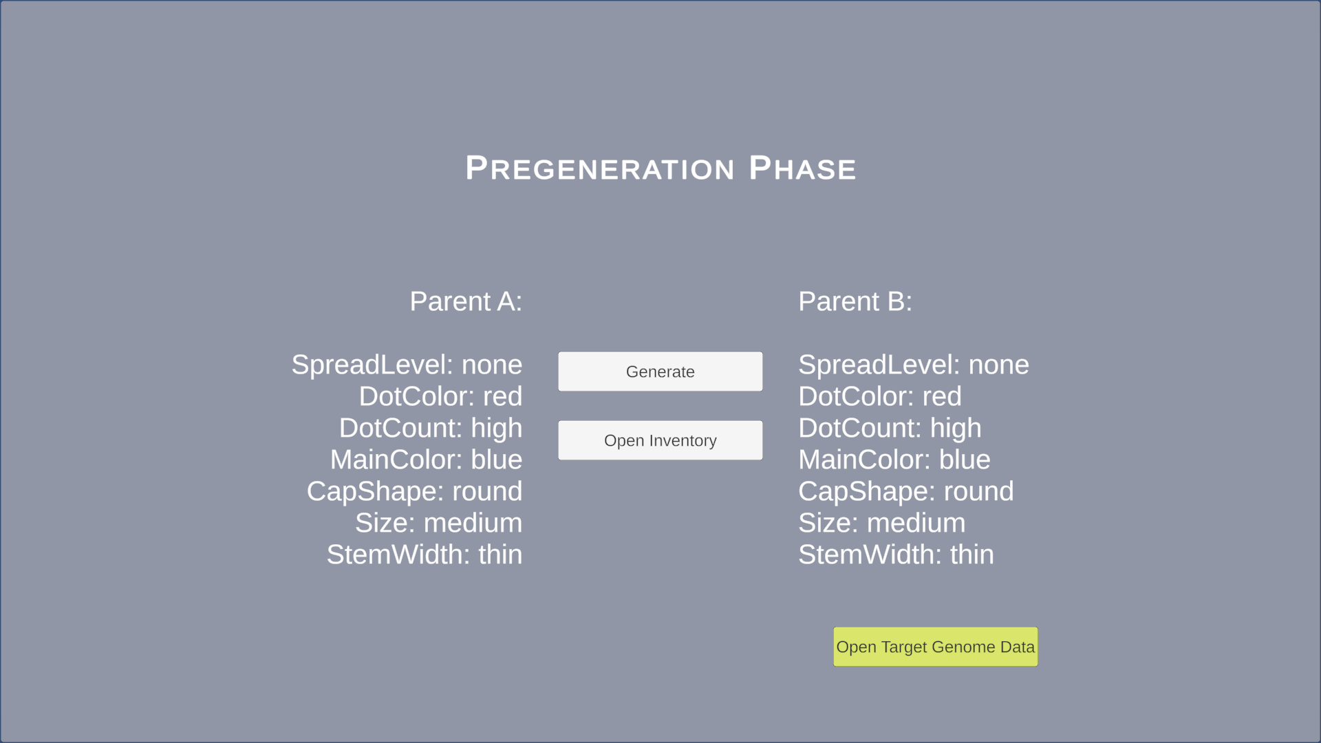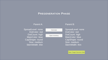 A UI based prototype where the player must genome splice two spores to obtain target traits while avoiding negative mutations. Negative are sustained through over-editing traits.